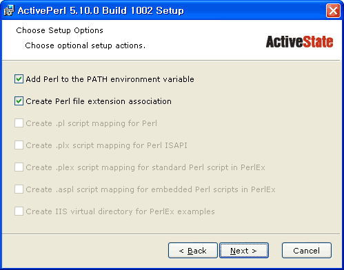 환경 변수에 ActivePerl이 설치된 경로를 추가할 것인지 지정할 수 있고, pl 파일을 ActivePerl에 연결할 것인지 지정할 수 있습니다. 환경 변수에 경로를 추가하는 것은 꼭 필요합니다.