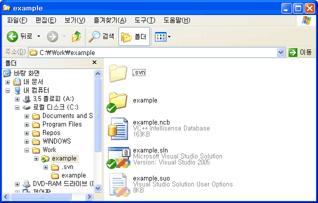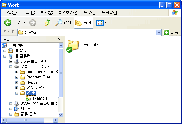이 example 프로젝트를 C:\Work\example에 체크아웃 합니다. 바탕 화면 같이 경로에 한글 디렉터리가 들어있으면 Subversion 인덱싱 스크립트가 정상적으로 동작하지 않습니다.