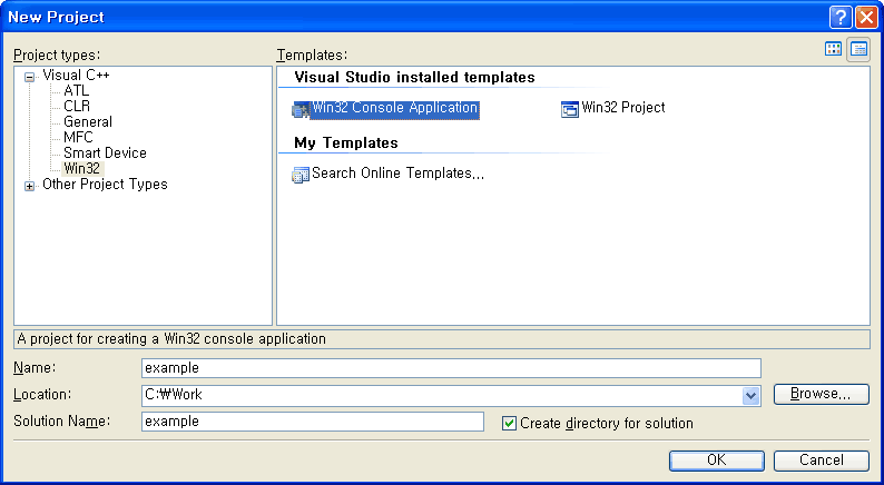 File → New → Project...메뉴를 실행합니다. Project types에서 Visual C++ → Win32의 Win32 Console Application을 선택합니다. 그리고 Name에는 example Location에는 C:\Work를 지정합니다. Create directory for solution에 꼭 체크합니다. Solution Name도 마찬가지로 example로 지정합니다. Create directory for solution을 체크했다면 Solution Name은 Name과 똑같이 자동으로 지정될 것입니다.