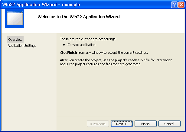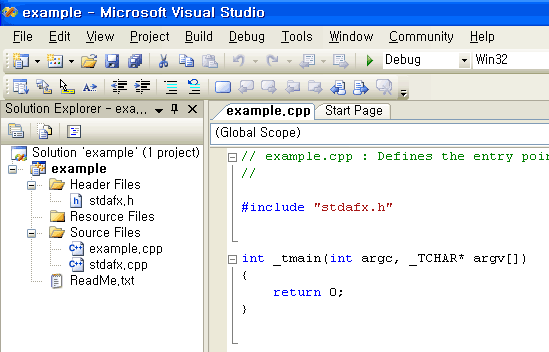 Visual C++ 2005로 example이라는 이름의 Win32 Console Application 프로젝트를 만들고 저장소에 추가합니다.