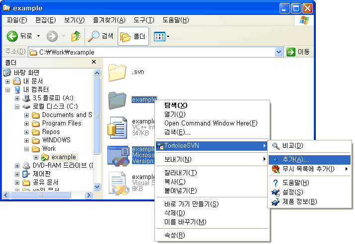 이제 탐색기에서 C:\Work\example로 이동합니다. 그리고 C:\Work\example 아래의 example 디렉터리와 example.sln 파일을 선택한 뒤 TortoiseSVN → 추가(A)... 메뉴를 실행합니다. example.ncb, example.suo 두 파일은 추가하지 않습니다.