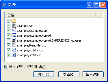 프로젝트를 구성하고 있는 파일을 추가합니다. 여기서 불필요한 파일인 example.vcproj.EXPERIENCE.xp.user 파일의 체크를 해제하고 확인을 누릅니다.