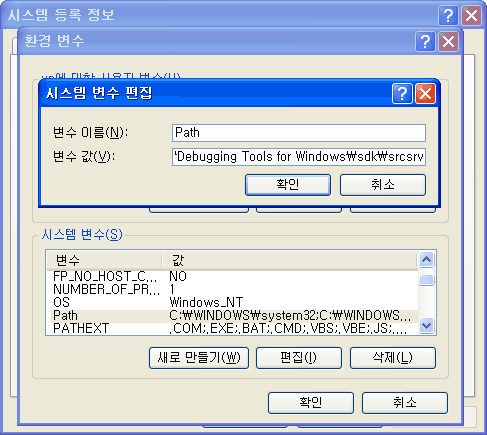 시작 → 제어판 → 시스템 → 고급 → 환경 변수(N)으로 이동합니다. 시스템 변수(S)에서 Path를 선택하고 편집(I) 버튼을 누릅니다. 그리고 C:\Program Files\Debugging Tools for Windows\sdk\srcsrv를 추가해줍니다. C:\WINDOWS\system32\WindowsPowerShell\v1.0;C:\Program Files\Debugging Tools for Windows\sdk\srcsrv 처럼 다른 경로가 앞에 있다면 경로와 경로 사이를 ;(세미콜론)으로 구분해주어야 합니다.
