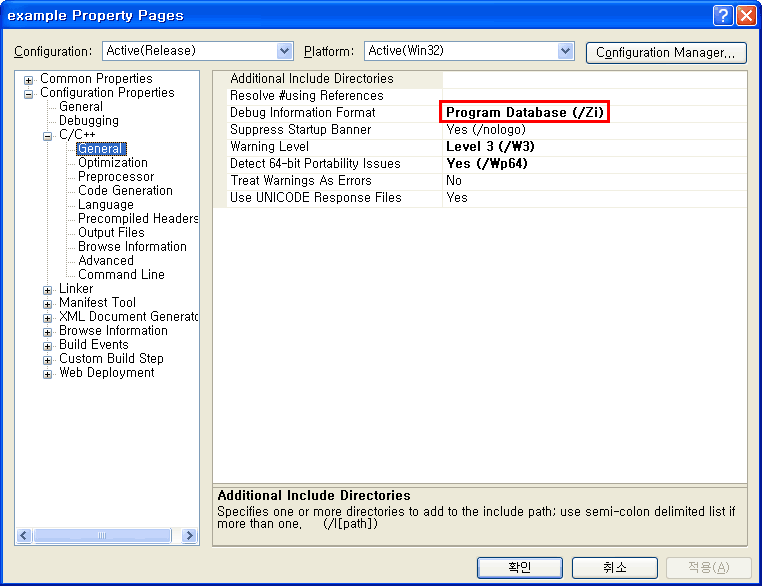 VS2005를 열고 example 프로젝트 속성(Properties) → C/C++ → General에서 Debug Information Format 부분이 Program Database (/Zi)로 설정되어 있는지 확인합니다. 이 부분이 Disabled로 되어 있으면 zero source files found 오류가 발생합니다.
