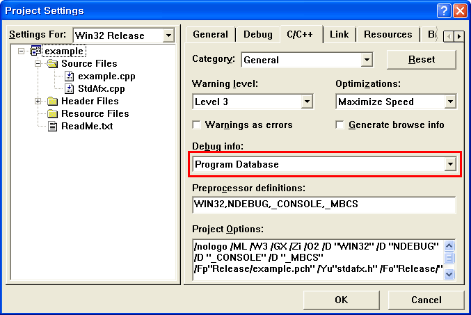 그림 4-29 Visual Studio 6.0에서 Debug info 설정을 확인하는 화면