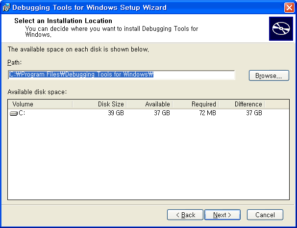 Debugging Tools for Windows를 설치할 경로를 지정합니다. 기본 설정대로 설치합니다.