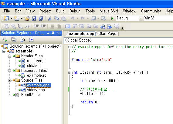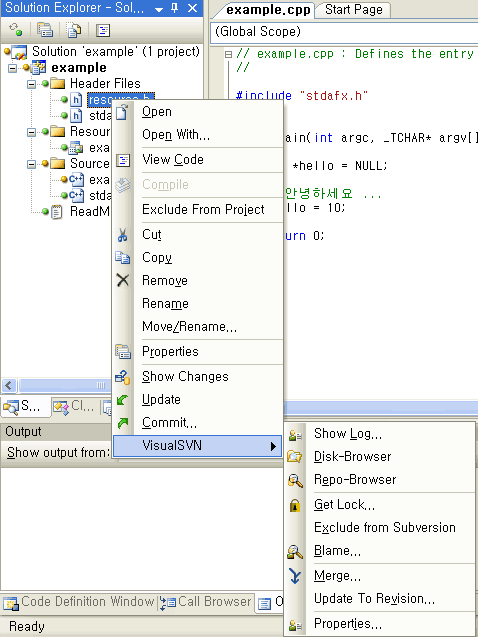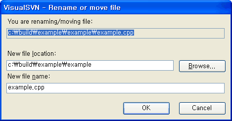 VisualSVN에서는 TortoiseSVN과는 별개로 자체적인 이름 바꾸기 기능을 제공해 주고 있습니다. 이름 바꾸기 뿐만 아니라 파일 이동도 가능합니다. 탐색기에서 TortoiseSVN으로 파일 이름을 바꾸어 버리면 Visual Studio 솔루션에서는 바뀐 파일을 인식하지 못하기 때문에 빌드가 되지 않을 수 있습니다. VisualSVN의 이름 바꾸기 기능은 Subversion 상의 이름도 바꾸어주고 Visual Studio 솔루션에도 적용해 줍니다. 따라서 Visual Studio를 주로 사용하는 프로젝트에서는 VisualSVN의 이름 바꾸기 기능을 사용하는 것이 편리합니다.