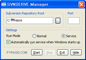 Start 버튼으로 svnserve.exe 또는 svnserve 서비를 실행하며, Stop 버튼으로 종료합니다. Exit 버튼은 SVNSERVE Manager과 svnserve.exe를 함께 종료합니다. 단 Service 모드일 때에는 SVNSERVE Manager만 종료합니다. Hide 버튼은 SVNSERVE Manager 창을 숨깁니다.