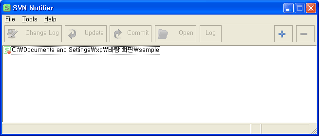 바탕 화면 sample이라는 프로젝트를 체크아웃 하고 + 버튼을 이용하여 등록 한 화면입니다. 작업 디렉터리는 여러 개를 등록할 수 있고, 로그 보기, 업데이트, 커밋 명령을 사용할 수 있습니다.