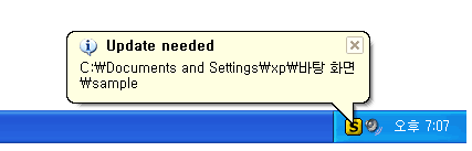 다른 사람이 프로젝트의 파일을 수정하여 커밋하면, SVN Notifier의 트레이 아이콘 색깔이 노란 색으로 변합니다. 그리고 업데이트가 필요하다는 메시지를 표시해줍니다.