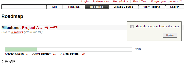 예를 들어 A라는 프로젝트가 있고, 이 프로젝트에 구현해야 할 기능이 20가지라면 구현해야 할 기능별로 티켓을 20개 생성합니다. 그리고 티켓에 해당하는 내용을 개발하고 기능 구현이 끝나면 티켓을 닫습니다. 이렇게 일을 진행하면 Trac의 Roadmap에서 기능 구현이 어느 정도 진행되어 가는지 쉽게 알 수 있습니다. 프로젝트 관리자는 티켓의 처리 상태에 따라서 일정을 조절할 수 있을 것입니다.