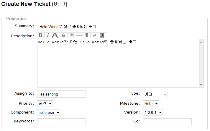 제목과 내용을 입력하고 Assign to에는 담당자의 ID를 입력합니다. Type은 개발 계획, Priority는 중간, Milestone은 Beta, Component는 hello.exe로 지정합니다. Version은 현재 릴리스된 버전이 없으므로 설정하지 않습니다.