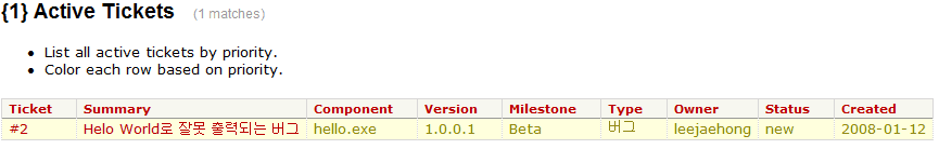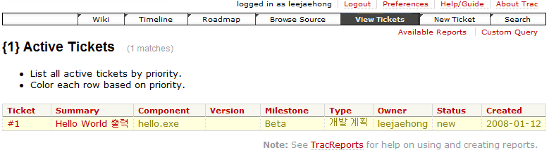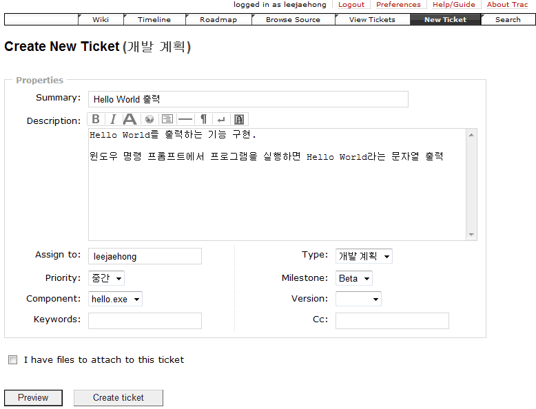 hello 프로젝트의 핵심 기능인 Hello World를 출력하는 기능을 구현하겠습니다. 이제 hello 프로젝트의 Trac 사이트에 접속하고 전에 만들어 두었던 사용자로 로그인합니다. New Ticket 메뉴를 선택하고 다음과 같은 내용으로 티켓을 생성합니다.