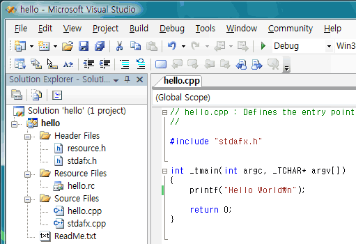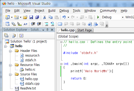 이제 Visual C++에서 hello 프로젝트를 열고 기능을 구현합니다.