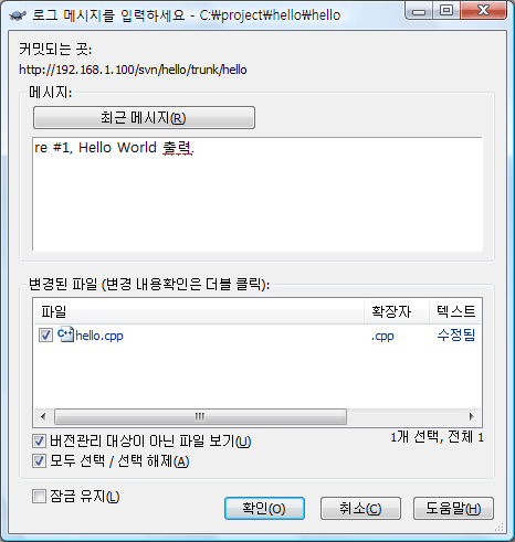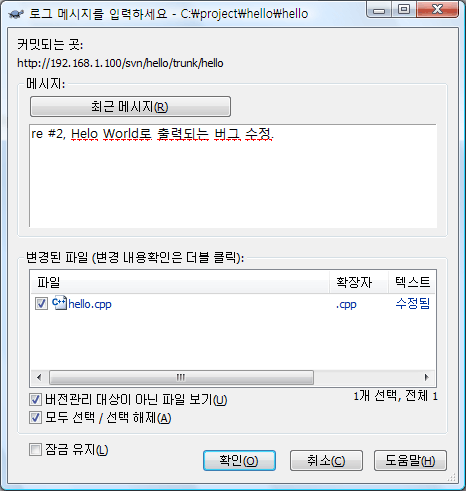 수정된 소스 코드를 커밋합니다. 이때 중요한 것은 re #1입니다. 1번 티켓에 현재 커밋 로그 메시지를 답글로 달겠다는 것입니다.