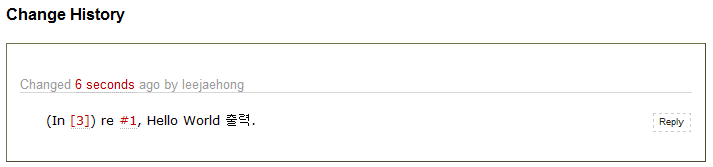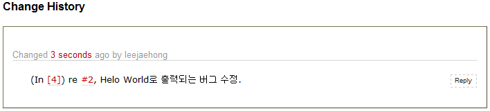 #1 티켓에는 다음과 같이 커밋 로그 메시지가 답글로 달리게 됩니다. (In [3])은 3번 리비전이라는 뜻입니다. [3] 링크를 누르면 3번 리비전에서 어떤 것들이 수정되었는지 살펴 볼 수 있습니다.