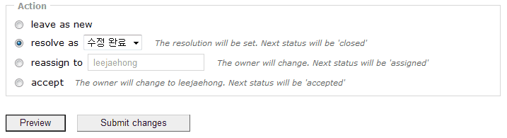 이제 기능 구현이 끝났으니 resolve as에 수정 완료를 선택하고 Submit changes 버튼을 눌러 티켓을 닫습니다.