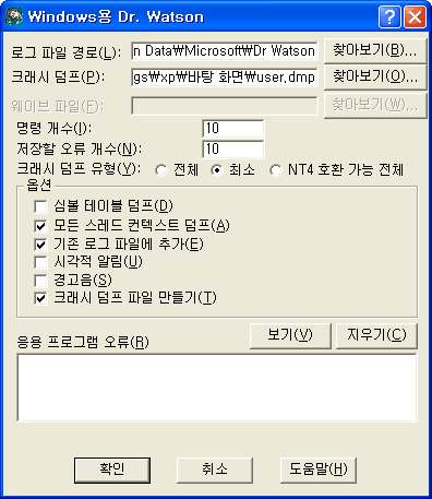 그리고 시작 → 실행에서 drwtsn32.exe를 다시 한번 실행합니다.