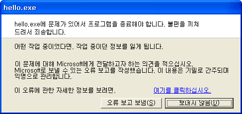 이제 hello.exe를 실행하면 다음과 같이 오류 보고 창이 나오게 되고 보내지 않음(D) 버튼을 눌러 창을 닫습니다. 바탕 화면에 user.dmp 파일이 생성된 것을 볼 수 있습니다.