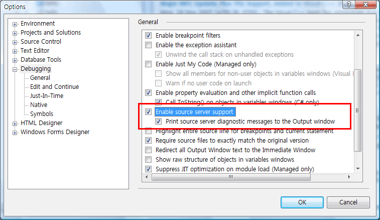 Enable source server support(소스 서버 지원 사용)와 Print source server diagnostic messages to the Output window(소스 서버 진단 메시지를 출력 창에 표시)를 체크합니다.