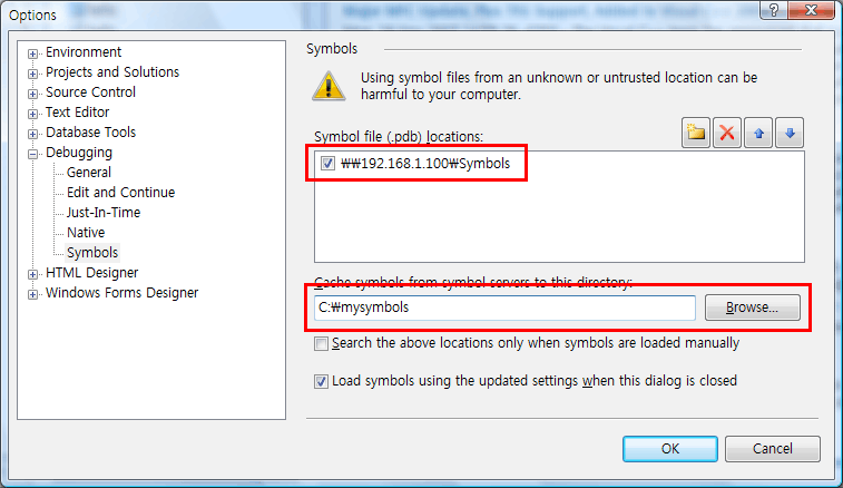 Symbol files (.pdb) locations:(기호 파일(.pdb) 위치(L):)에 \192.168.1.100\Symbols를 추가합니다. 그리고 Cache symbols from symbol servers to this directory:(기호 서버에서 이 디렉터리로 기호 캐시(C):)에 C:\mysymbols를 지정합니다.
