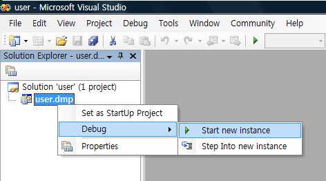 이제 user.dmp를 더블클릭 하여 Visual Studio 2005로 열면 다음과 같이 나옵니다. 여기서 user.dmp를 선택한뒤 오른쪽 마우스를 누르면 나오는 팝업 메뉴에서 Debug(디버그(G)) → Start new instance(새 인스턴스 시작(S))를 선택합니다.