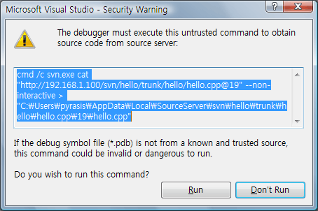 Start new instance(새 인스턴스 시작(S))를 선택하면 다음과 같이 Security Warning(보안 경고) 창이 나옵니다. 그리고 http://192.168.1.100/svn/hello/trunk/hello.cpp 리비전 19를 가져오겠다는 내용이 표시됩니다. Run(실행(R))을 눌러 해당 내용을 실행합니다.