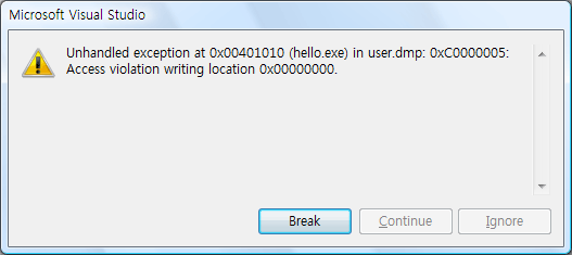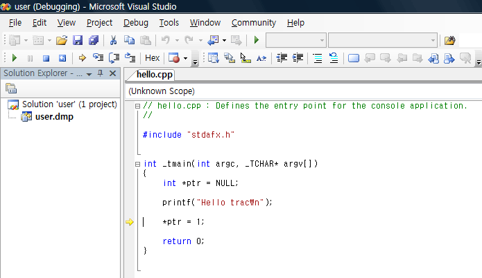 이제 user.dmp 파일이 열렸습니다. 그리고 WinDBG에는 hello.cpp의 내용이 나오고, 예외가 발생한 지점인 *ptr = 1;을 블록 지정 상태로 표시해줍니다.