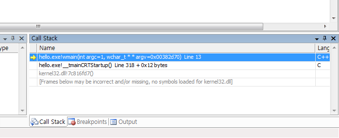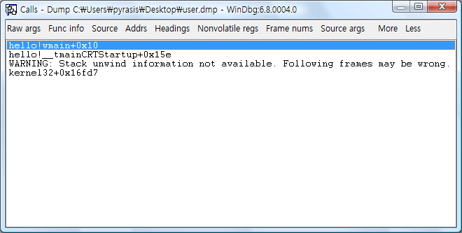 Visual Studio 2005에서 덤프 파일을 열었을 때, 덤프 파일에 따라서 호출 스택이 정확하게 표시되지 않을 때가 있습니다. 이런 덤프 파일은 WinDBG에서 열면 호출 스택이 정상적으로 표시됩니다. 또한 Visual Studio 2005에서 열리지 않는 덤프 파일도 있는데, 이런 덤프 파일도 WinDBG에서 열면 됩니다.