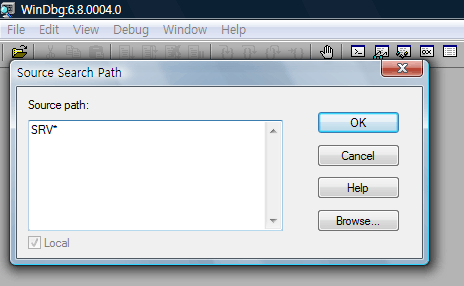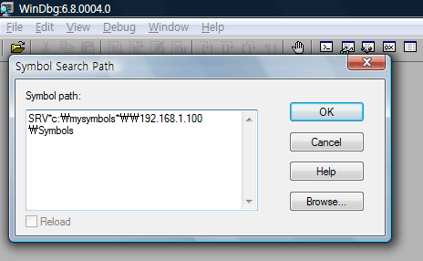 WinDBG를 실행하고 File → Symbol File Path ...를 선택합니다. 그리고 SRVc:\mysymbols\192.168.1.100\Symbols를 입력합니다.