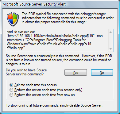 workspace를 저장하면 곧바로 Microsoft Source Server Security Alert 창이 나옵니다. http://192.168.1.100/svn/hello/trunk/hello.cpp 리비전 19를 가져오겠다는 내용이 표시됩니다. 여기서 Yes를 눌러 해당 내용을 실행합니다.