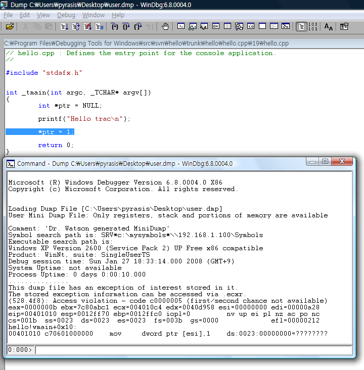 우리는 심볼 파일(PDB)에 Subversion 저장소 정보를 인덱싱하였고 심볼 서버에 저장해놓았습니다. Visual Studio 2005는 덤프 파일에 맞는 심볼 파일을 심볼 서버(\192.168.1.100\Symbols)에서 가져온 뒤 C:\mysymbols 디렉토리에 저장합니다. 그리고 심볼 파일에 저장된 Subversion 저장소 정보에 따라 소스를 가져와서 사용자에게 보여주는 것입니다. 이제 hello.cpp의 내용이 나오고, 예외가 발생한 지점인 *ptr = 1; 부분을 화살표로 표시해줍니다.