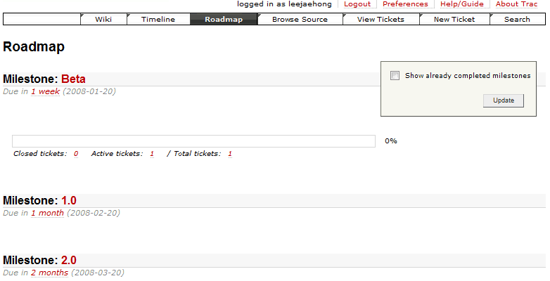 Roadmap 메뉴에서도 Beta 마일스톤에 티켓이 1개 등록 되어 있다는 것을 확인할 수 있습니다.