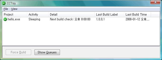 이제 기능이 구현되었습니다. 빌드 스크립트에서 설정한 대로 20:00에 자동 빌드가 되어 실행파일이 만들어 질 것입니다. CCTray를 이용하여 강제 빌드를 할 수도 있을 것입니다.