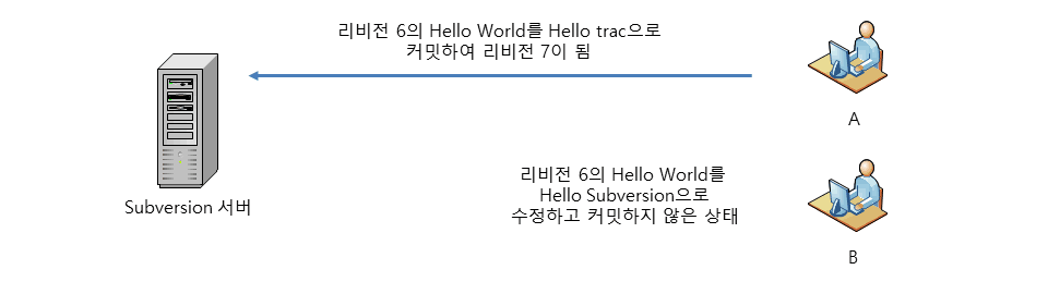 B는 A가 소스 코드를 수정하여 커밋한 줄 모르고 업데이트를 하지 않은 채 리비전 6의 printf("Hello World\n");를 printf("Hello Subversion\n");으로 수정하였습니다. B의 작업 디렉터리는 아직 리비전 6입니다.