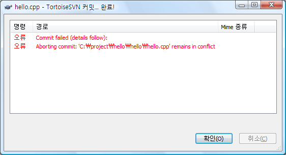 아직 충돌이 해결된 것이 아닙니다. 충돌 아이콘이 남아 있는 상태에서 커밋을 하게 되면 다음과 같이 커밋이 실패하게 됩니다.