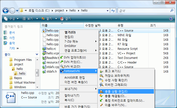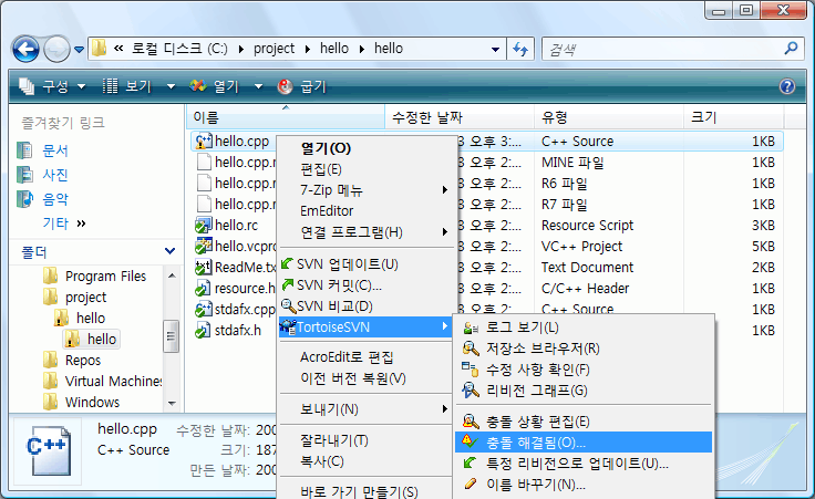 hello.cpp를 선택하고 TortoiseSVN → 충돌 상황 편집(E)을 선택합니다.