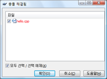 충돌을 해결할 파일이 나옵니다. hello.cpp만 선택했으므로 hello.cpp 만 나옵니다. 충돌한 파일이 여러개일 때에는 여러 파일이 표시됩니다.