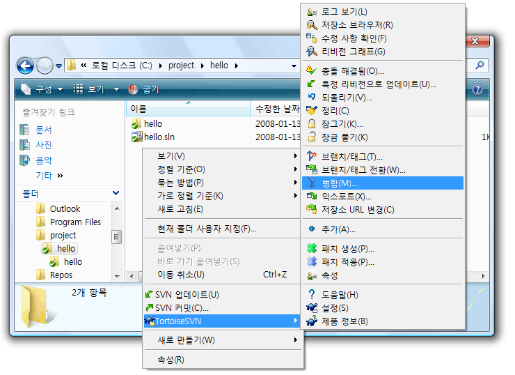 다시 리비전 9의 내용으로 돌아가고자 한다면 체크아웃한 프로젝트의 최상위 디렉터리(C:\project\hello)에서 다음과 같이 TortoiseSVN → 병합(M)...을 실행합니다.