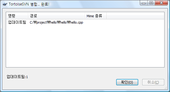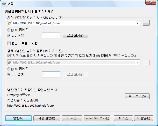 여기서 설정해야 할 부분은 종료 부분에 리비전(R) 부분입니다. 이 부분에 되돌아가고 싶은 리비전을 입력합니다. 이번 예제에서는 리비전 9를 설정했습니다. 시작 부분의 리비전은 설정하지 않아도 됩니다. 주의할 부분은 "병합 결과가 저장되는 작업사본 위치:"가 체크아웃한 프로젝트의 최상위 디렉터리(C:\project\hello)가 맞는지 확인하는 것입니다.