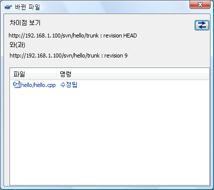 비교 버튼을 눌러보면 현재 리비전과 리비전 9사이에 어떤 파일들이 바뀌었는지 표시됩니다.