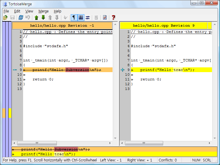 hello.cpp 파일을 더블클릭하면 어떻게 되돌려질지 표시됩니다. printf("Hello Subversion\n");를 printf("Hello trac\n");로 다시 되돌린다는 것을 알 수 있습니다.