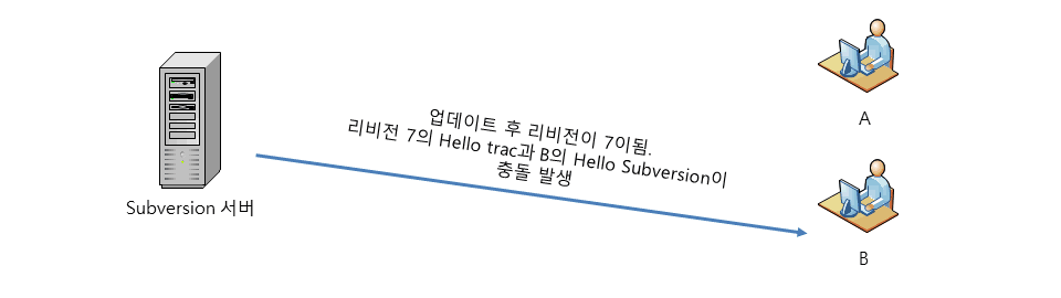 충돌(Conflict)은 Subversion으로 여러 사람이 하나의 소스를 공동으로 작업할 때 자주 발생합니다. 즉 A라는 사람이 소스 코드를 수정하여 커밋하였고, B라는 사람은 A가 커밋한 부분을 수정한 채로 업데이트 했을 때 발생합니다. 즉 B의 작업 디렉터리 상의 내용과 저장소 상의 내용이 달라서 충돌이 발생한 것입니다.
