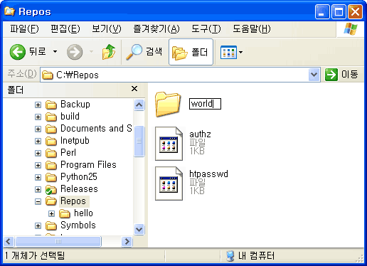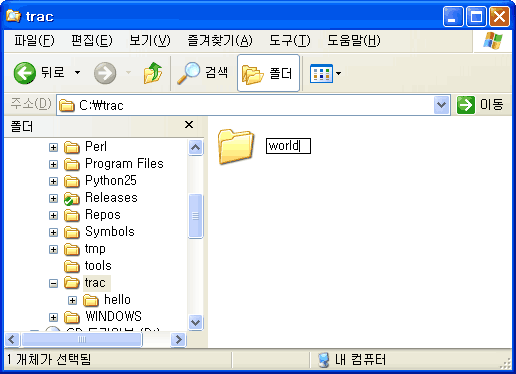 4. C:\trac으로 이동합니다. 마찬가지로 바꾸고 싶은 프로젝트의 디렉터리를 선택하고 이름을 바꿉니다. 여기서도 hello 디렉터리를 world로 바꾸었습니다. Trac 프로젝트와 Subversion 저장소의 이름은 일치시키는 것이 좋습니다.