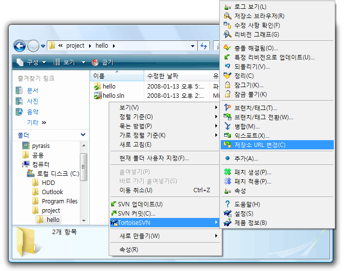 이제 개발자PC로 이동합니다. hello 프로젝트를 체크아웃한 곳으로 가서 TortoiseSVN → 저장소 URL 변경(C)를 실행합니다.
