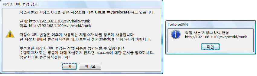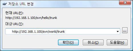 대상 URL(T):에 이름을 바꾼 저장소의 경로를 입력합니다. hello에서 world로 바꾸었으므로 저장소 경로는 http://192.168.1.100/svn/world/trunk가 됩니다.