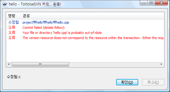 이제 충돌 해결이 끝났습니다. hello.cpp의 충돌 아이콘과 hello.cpp.mine, hello.cpp.r6, hello.cpp.r7 파일이 사라졌습니다. 이제 B는 hello.cpp를 커밋하면 됩니다. TortoiseMerge에서 A가 수정한 printf("Hello trac\n");(Use text block from "theirs")을 선택했다면 hello.cpp는 아무 변화 없이 초록색 아이콘으로 표시될 것입니다.