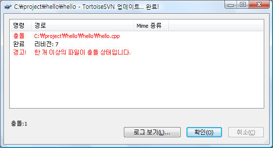 풀이하자면, B(mine)가 수정한 것은 Hello Subversion, A가 수정하여 커밋한 것(r7)은 Hello trac 이라는 뜻입니다.