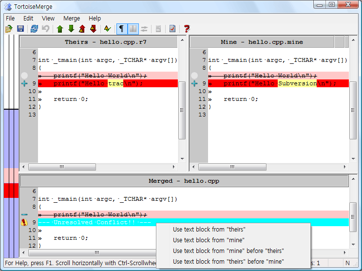 printf("Hello Subversion\n");printf("Hello trac\n");을 사용하게 됩니다. - Use text block from "theirs" before "mine" : 왼쪽 부분과 오른쪽 부분을 동시에 다 사용하겠다는 것입니다. mine 앞에 theirs를 사용한다고 되어 있으므로 이것을 선택하면