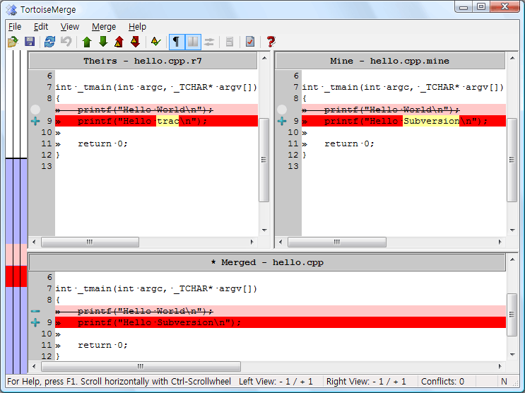 충돌 상황 편집(E)을 선택하면 TortoiseMerge가 실행됩니다. 3부분으로 표시되는데, 왼쪽 위는 A가 printf("Hello World\n");를 printf("Hello trac\n");으로 수정한뒤 커밋하여 r7이 되었다는 것을 표시해주고 있고, 오른쪽 위는 B가 printf("Hello World\n");를 printf("Hello Subversion\n");으로 수정하였다는 것을 표시해 줍니다. 아래쪽은 printf("Hello World\n"); 부분이 충돌했다는 것을 표시해 주고 있습니다. 실제 충돌 해결 작업은 아래쪽 창에서 이루어지게 됩니다.